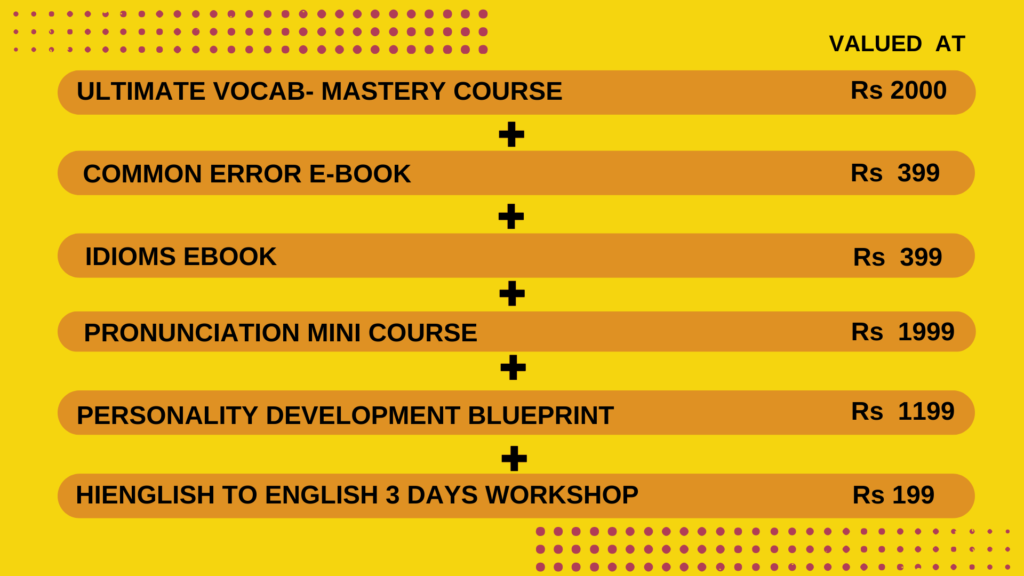 Valued at Rs. 1999 Pronunciation mini course एक ऐसा course है जो आपके pronunciation को बेहतर करने में आपकी मदद करता है और आपकी English को next level पर ले जाने के लिए एक map की तरह काम करता है । यह video course की कीमत Rs.1999 से भी अधिक होती है। but अभी इस कोर्स में enroll करने आपको यह फ्री मिले